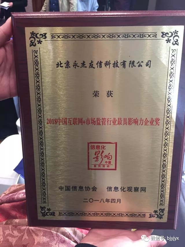4月12日,由中國信息協(xié)會(huì)主辦、信息化觀察網(wǎng)和中國信息協(xié)會(huì)傳媒中心承辦的“2018中國互聯(lián)網(wǎng)+產(chǎn)業(yè)創(chuàng)新發(fā)展論壇”在北京盛大開幕。本次論壇評選出2018互聯(lián)網(wǎng)+產(chǎn)業(yè)創(chuàng)新發(fā)展行業(yè)五大類獎(jiǎng)項(xiàng)。憑借信息化市場監(jiān)管領(lǐng)域的突出表現(xiàn),北京永杰友信科技有限公司榮獲“2018中國互聯(lián)網(wǎng)+市場監(jiān)管行業(yè)最具影響力企業(yè)獎(jiǎng)”。